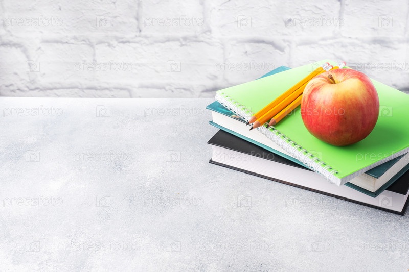 Свежее красное яблоко на куче книг и тетрадей. Концепция школьного завтрака. Копировальное пространство,