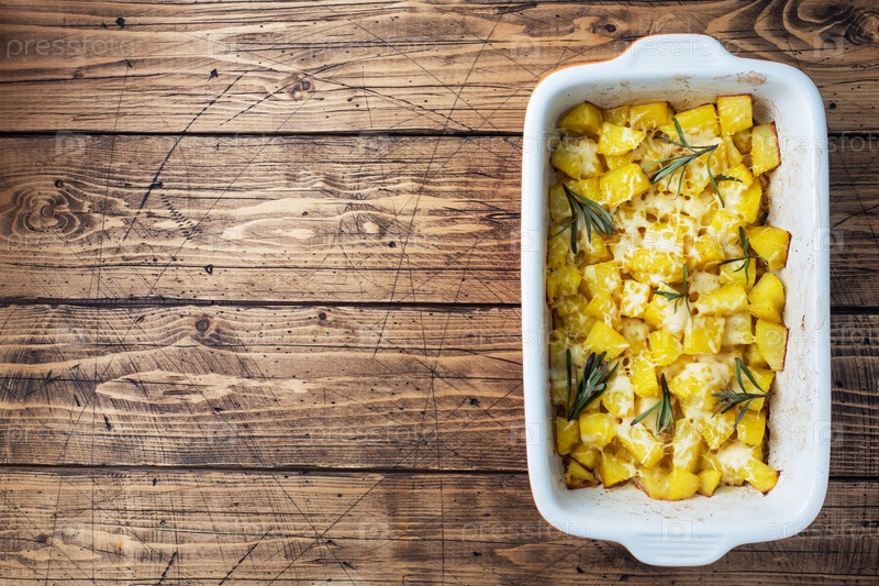 Вкусные жареные картофели с пряностями сыром и розмарином в керамической тарелке для выпечки на деревянном рустическом фоне
