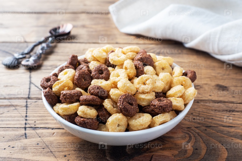 Шоколадные и кукурузные кольца из натуральных зерновых с молоком в тарелке деревянный рустический фон, копировальное пространство