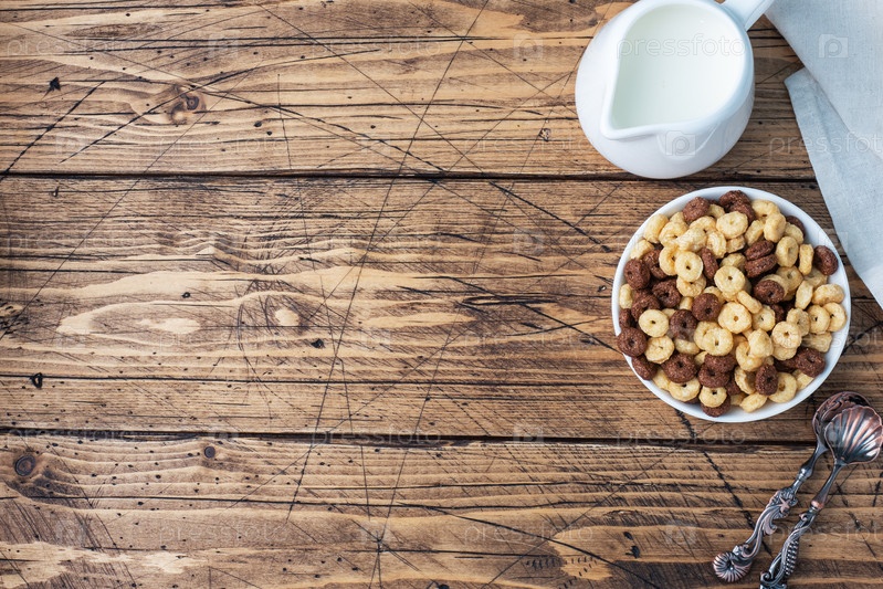 Шоколадные и кукурузные кольца из натуральных зерновых с молоком в тарелке деревянный рустический фон, пространство для копирования