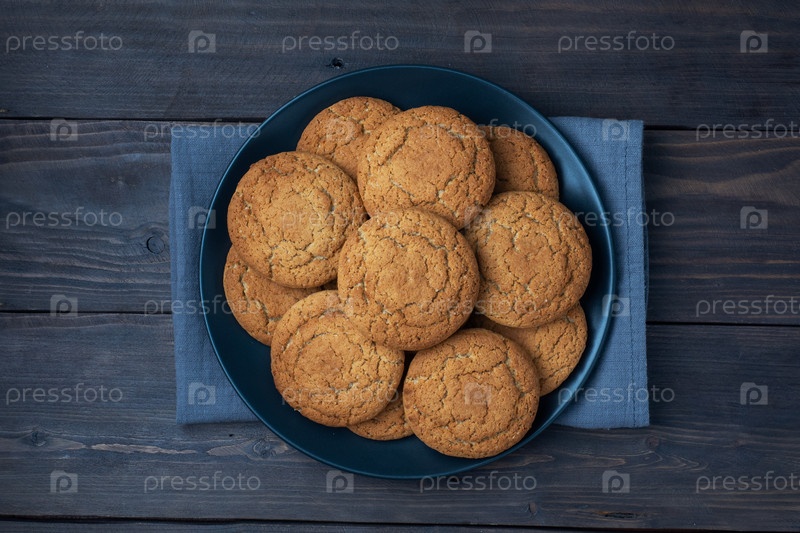 Естественные домашние овсяные печенье на тарелке, темный деревянный фон, пространство для копировки