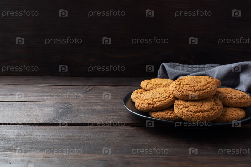 Естественные домашние овсяные печенье на тарелке, темный деревянный фон, пространство для копировки