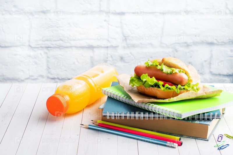 хот-дог со салатом помидоров и колбасой. тетради и канцелярские принадлежности. концептуальный школьный завтрак. скопировать пространство