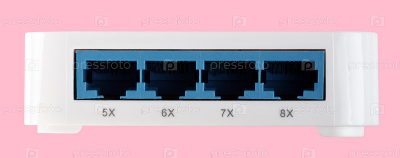 Белый 8-портный пластиковый коммутатор Ethernet изолирован на розовом фоне в сухой день