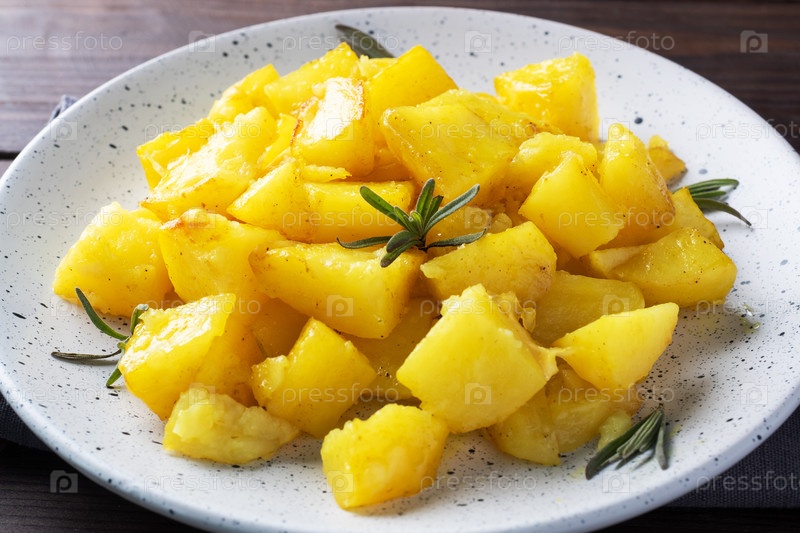 Вкусные жареные картофели с пряностями, сыром и розмарином на тарелке, ближе