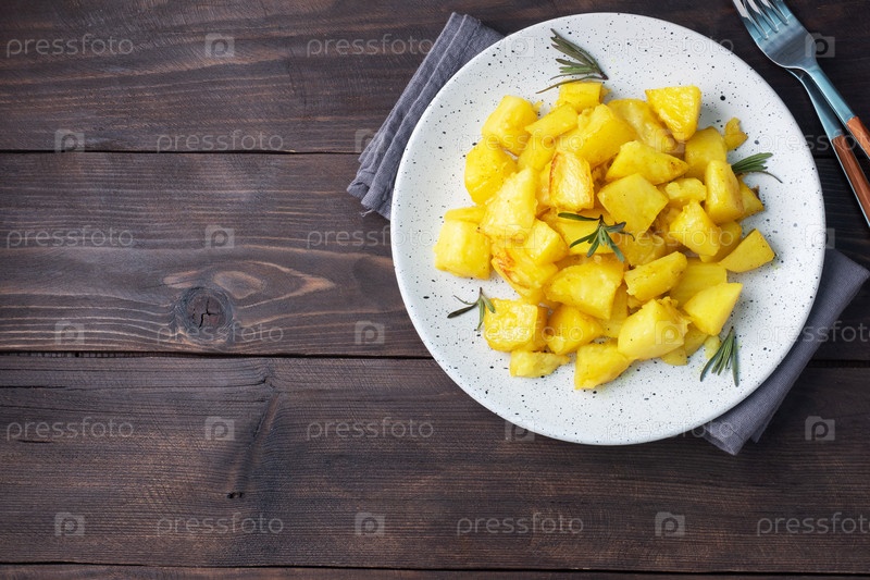Вкусные жареные картофели с пряностями сыром и розмарином на тарелке, темный деревянный стол
