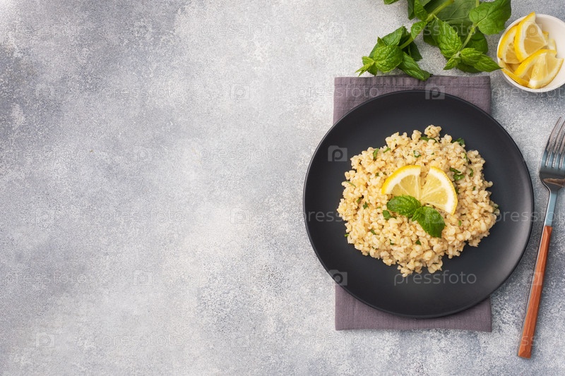 Приготовленный булгур с свежим лимоном и мятой на тарелке. Традиционное восточное блюдо под названием Tabule. Серый бетонный фон верхний вид, копирование пространства