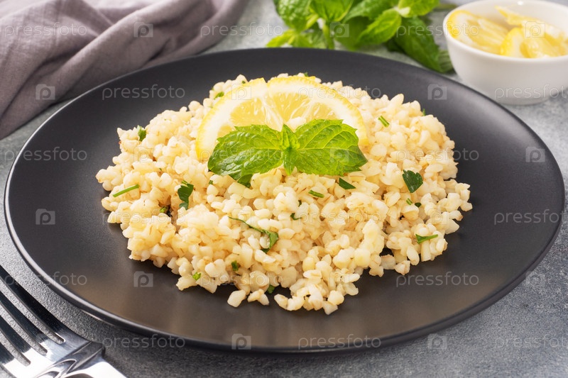 Приготовленный булгур с свежим лимоном и мятой на тарелке.Традиционное восточное блюдо под названием Tabule.Серый бетонный фон