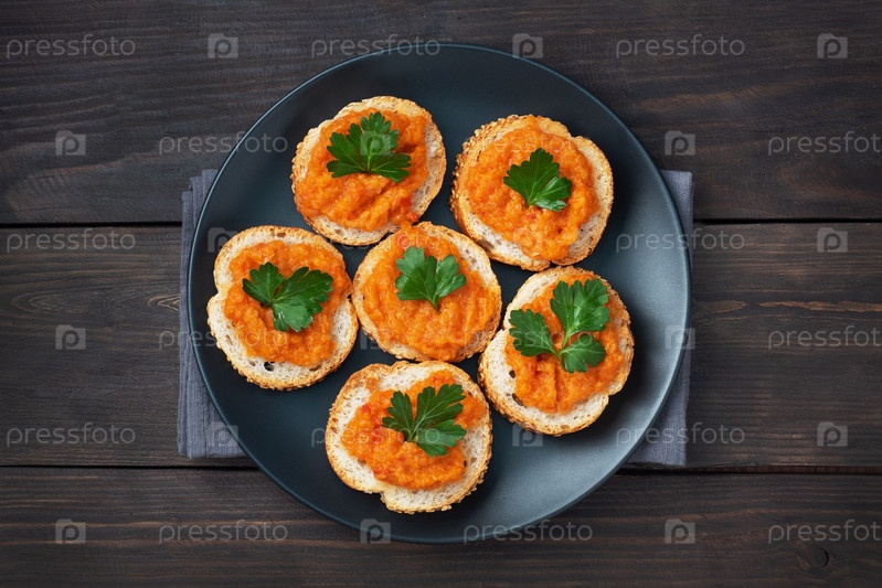 бутерброды с хлебом из капусты и кайваром из помидоров и лука. домашняя вегетарианская еда. консервированное жареное овоще. деревянный фоновый вид сверху, пространство для копирования