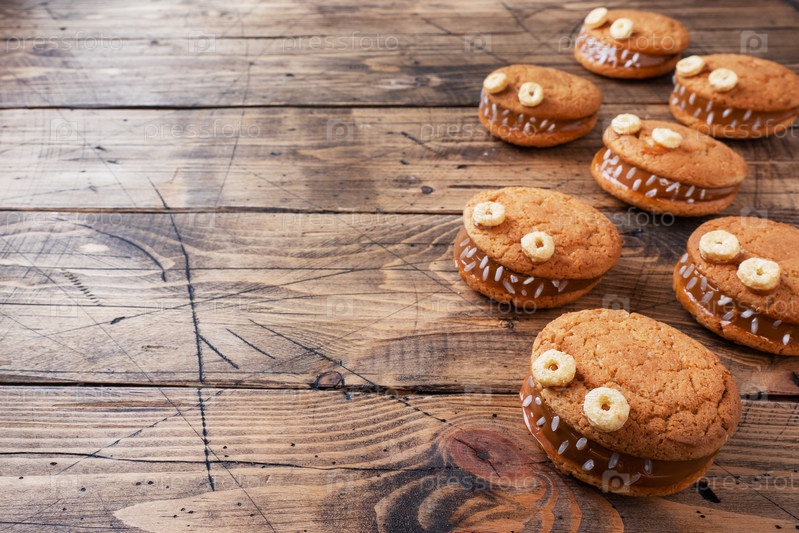 Пирожные с кремовой пастой монстров, чтобы отпраздновать Хэллоуин. Забавные лица домов из овсяных печенья и вареного конденсированного молока. Копировать пространство