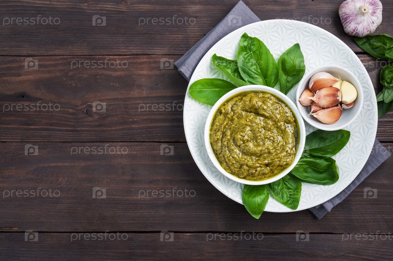 Соус песто в тарелке и свежие листья базилика с чесноком, темный деревянный фон, пространство для копирования