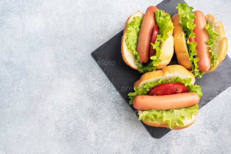 хот-доги на бетонном сером фоне. хот-дог со салатом помидора и колбасой. скопировать пробелы