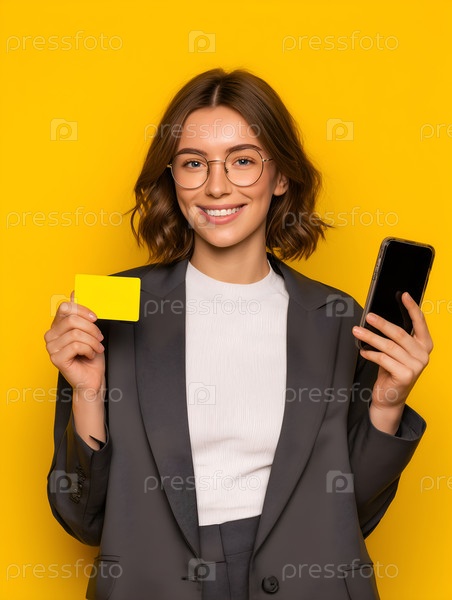 Девушка с банковской картой и телефоном на желтом фоне