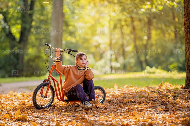 Девушка с оранжевым скутером Kick сидит на выпавших осенних листьях в парке