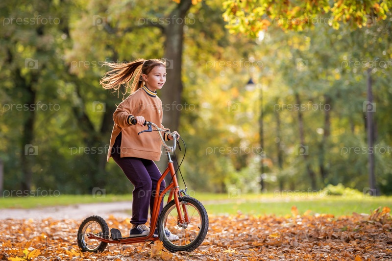 Молодая женщина едет на скутере по тропинке, покрытой осенними листьями в парке в солнечный день
