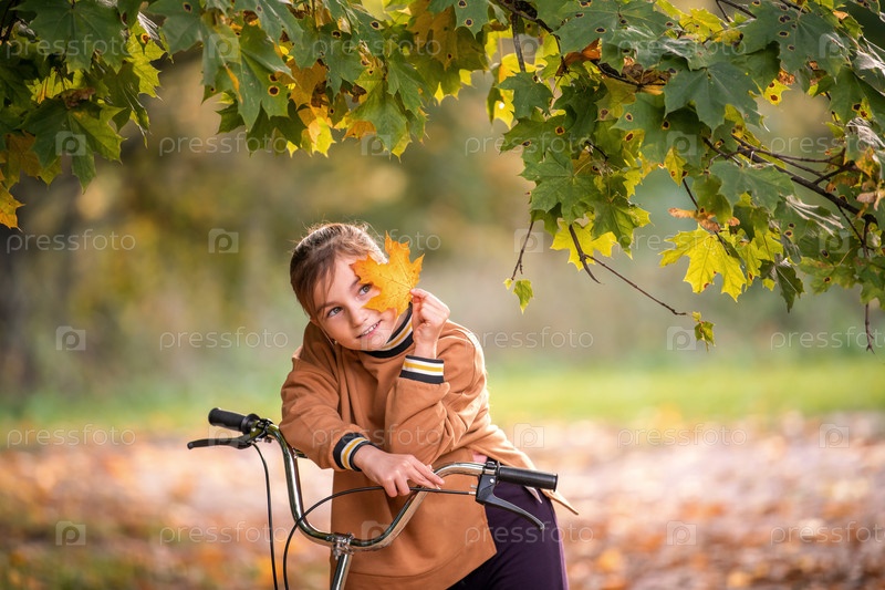 Молодая девушка на велосипеде закрывает глаза ярко-оранжевым осенним листом