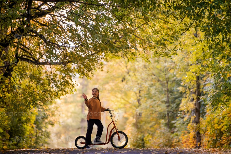 Девушка на скутере машет рукой по осенней дороге, снаружи