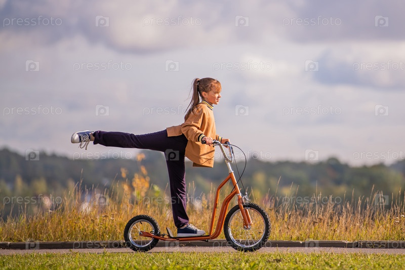 Подростковая девочка сидит на скутере среди осенних листьев в парке и обнимает свою сибирскую собаку хаски