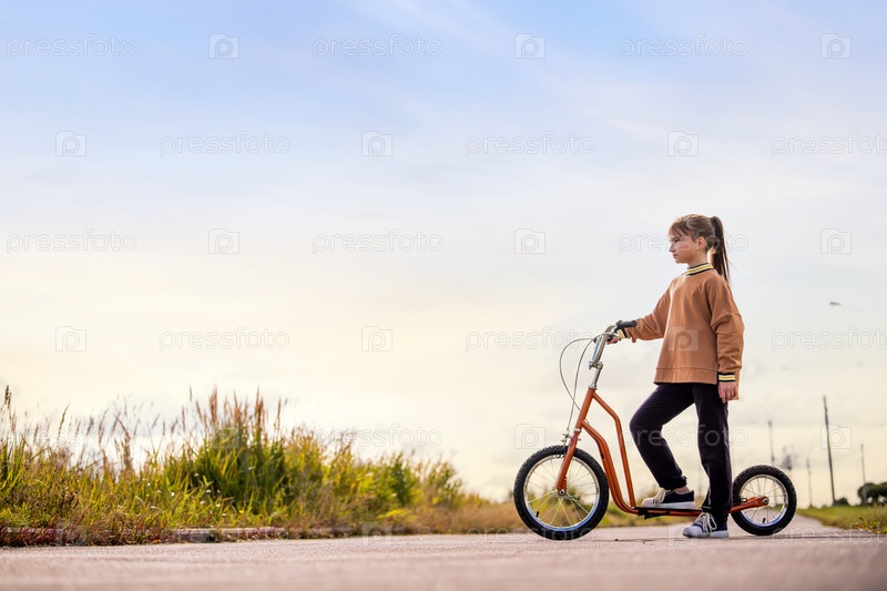 Молодая девушка стоит со своим оранжевым скутером на пустой дороге рядом с травянистой местностью, выглядя задумчивой