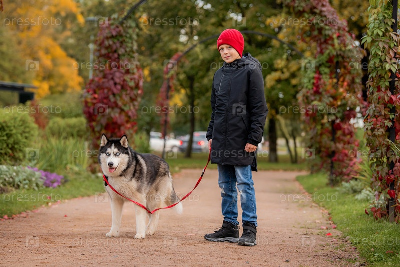 Маленький мальчик и собака на красном поводке стоят на тротуаре в парке с осенними листьями