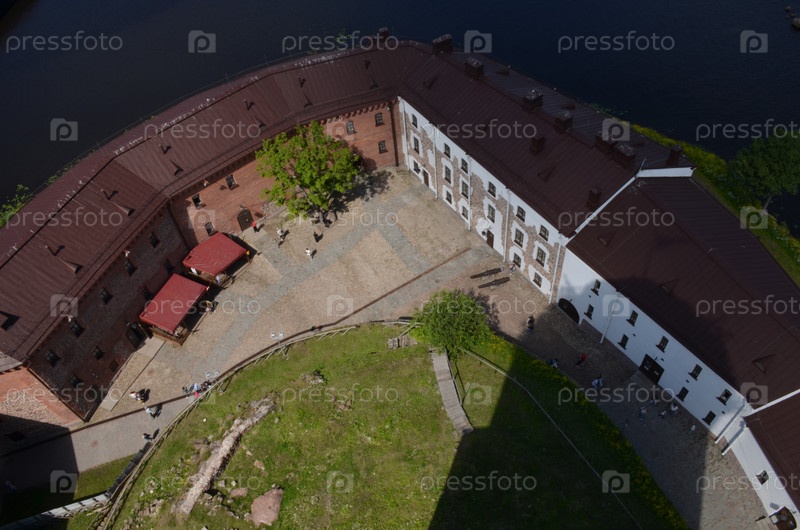 Вид на внутренний двор Выборгского замка с смотровой площадки башни Святого Олафа: Zeichhaus, Малый арсенал, административные здания