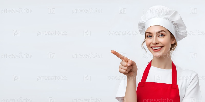 Улыбающийся шеф-повар в красном фартуке указывает на сторону