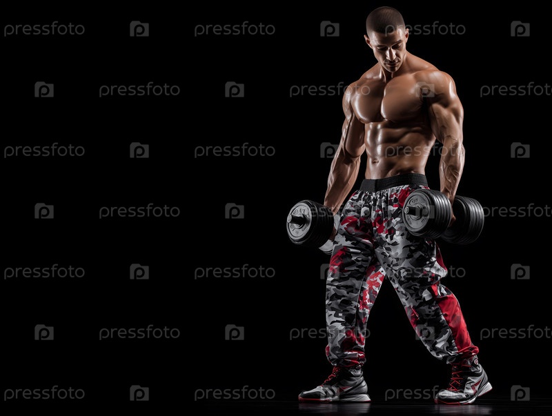 Мускулистый мужчина с гантеликами в камуфляжных штанах на черном фоне