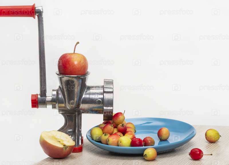Большое яблоко проходит через мясную мельницу и превращается в маленькие яблоки. изолировано. шутка