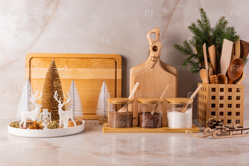 Красивый стильный кухонный фон с экологически чистой кухонной утварью, имбирным хлебом, режущими досками на мраморном столешнице с рождественскими украшениями