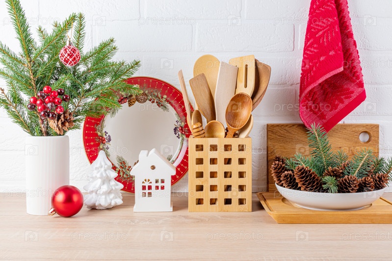 Фронтальный вид деревянной кухонной столешницы, украшенной на Новый год и Рождество. красные блюда, ювелирные изделия, ветви елей. концепция праздника