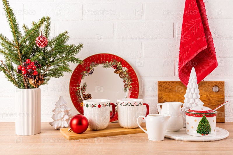 Новогодний кухонный фон с праздничными блюдами в красном, белых тонах с новогодним узором. украшенные ветви елей в вазе. вид спереди