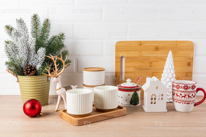 Красивый набор керамических кружек, блюда с новогодним узором на деревянной столешнице, украшенные для Нового года и Рождества