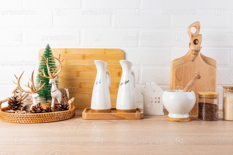 Площадь для хранения специй на столешнице кухни с украшениями на Новый год и Рождество. свечи, дома, шары, ветви елей. вид спереди