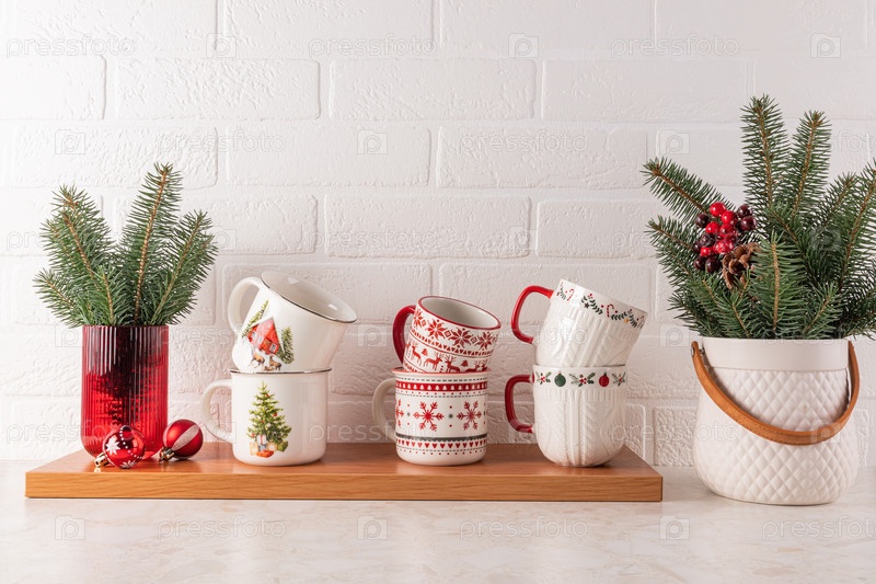 Набор красивых кружек с новогодним орнаментом на кухонной стойке среди ваз с ветвями елей. вид спереди. Новогодняя кухня