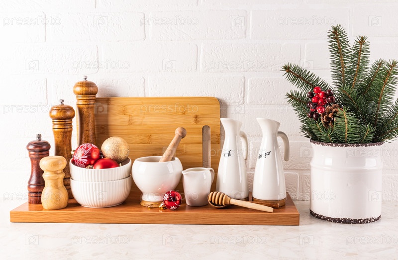Древесная мельница со специями, керамические бутылки с маслом на деревянной стойке с новогодними и рождественскими украшениями. Фронтальный вид. Концепция новогоднего декора