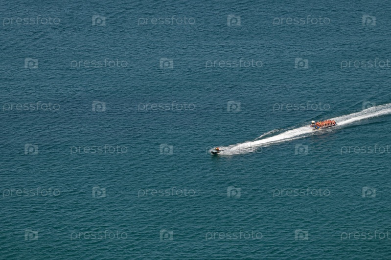 Водный мотоцикл буксирует банан с пассажирами в спасательных жилетах на поверхности синего моря