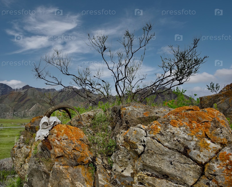 Россия.Западная Сибирь, Алтайские горы.Вид черепа горной козлы, лежащей на скалах в долине реки Катун