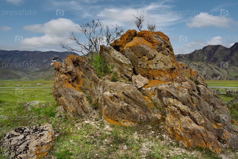 горный алтай. вид на череп горного козла лежащий на скалах в долине реки катунь.