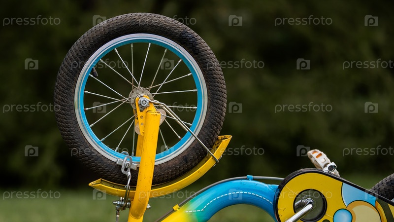 Переднее колесо детского велосипеда и деталь педали.Красивый велосипед, стоящий вверх ногами, готов к обслуживанию или ремонту дома