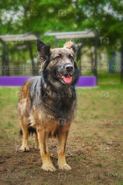 Красная собака-монгрел лежит на животе на траве, растягивая передние лапы вперед. весна
