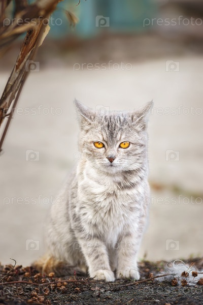Серый полосатый кот гуляет на поводке на зеленой траве под открытым небом