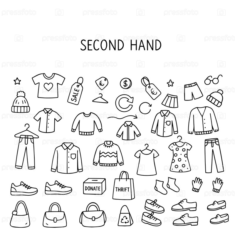 Подержанная одежда и символы обуви. Дайте одежде вторую жизнь. Вторая рука. Базар. Редкие предметы. Стильные находки