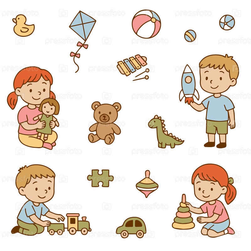 Дети играют с разными игрушками. цветная иллюстрация