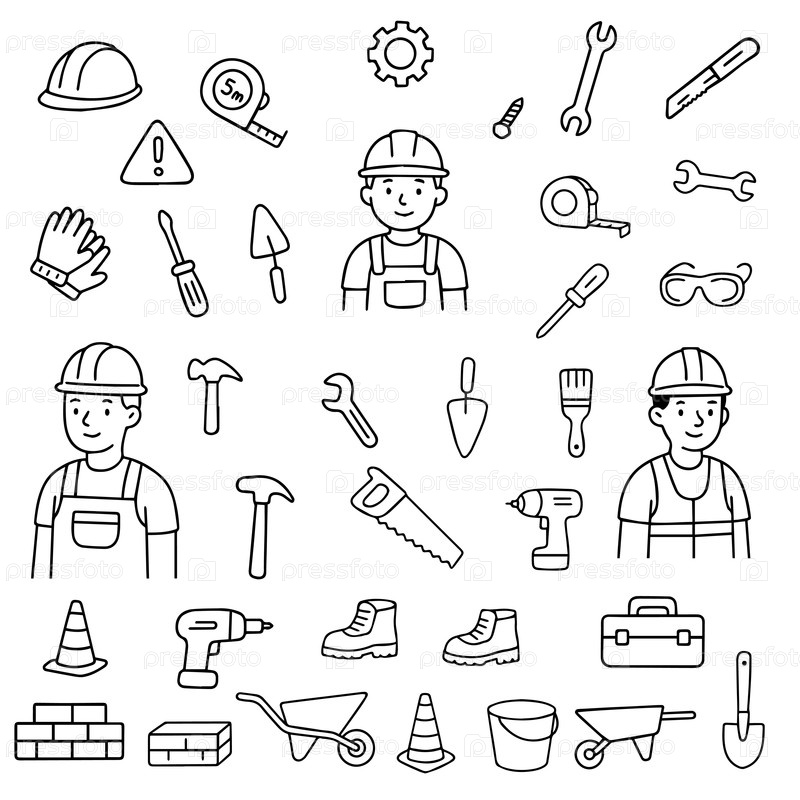 Иконы Doodle для строителей и рабочих инструментов