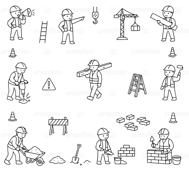 Строители, строители и инженеры. Строители со строительной техникой. Строители строят дома с инструментами и оборудованием на стройплощадке. Иллюстрация вектора