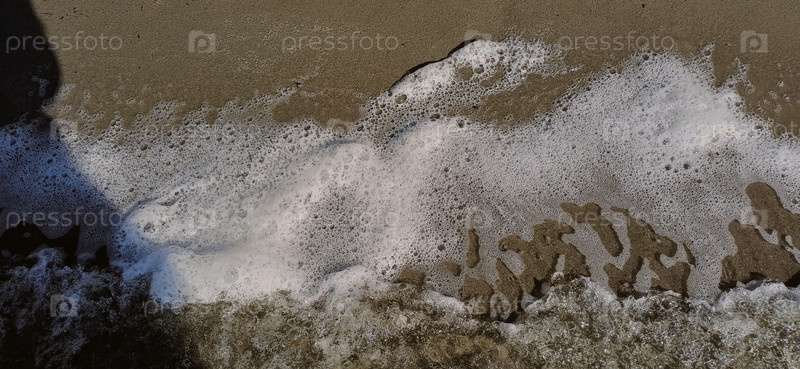 Волны мягко прокатываются на песчаный пляж во время солнечного света, создавая пену и брызги на берегу