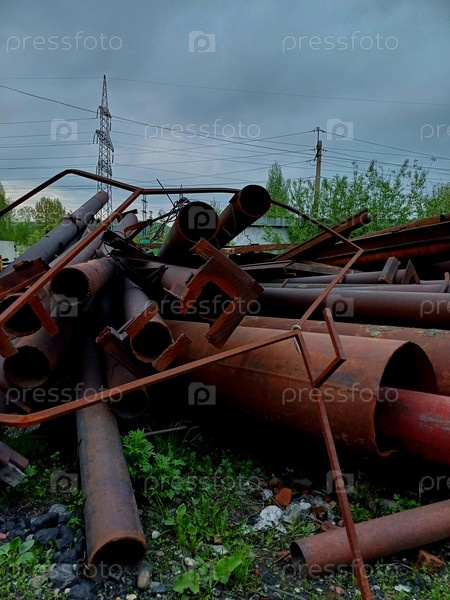 Ржавые металлические трубы и промышленный мусор в заброшенном районе под облачным небом рядом с линией электропередач