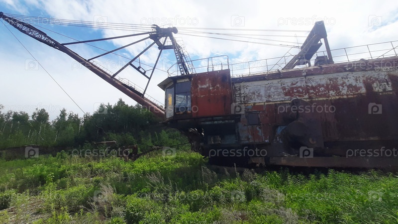 Заброшенный экскаватор ржавеет в заросшем ландшафте под облачным небом на бывшей промышленной площадке