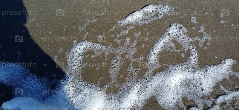Волны мягко примыкают к песчаному берегу, оставляя пенные узоры под ярким солнечным светом вблизи побережья