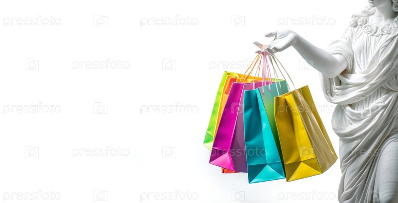 Статуя в классическом стиле держит яркие подарковые пакеты